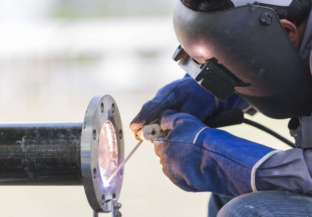 Profesional,Welder,In,Protective,Uniform,And,Mask,Welding,Metal,Pipe